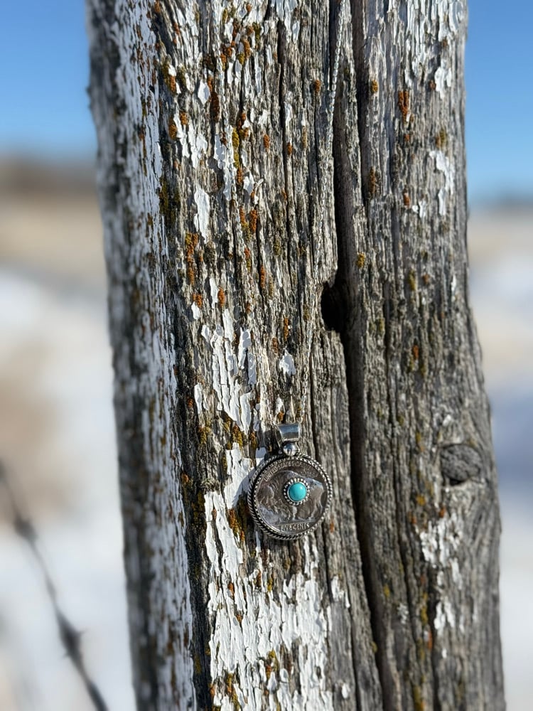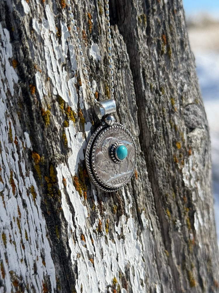 This handcrafted pendant features a vintage buffalo nickel framed in sterling silver rope and set with a genuine 4mm Kingman turquoise stone at the center. The iconic American buffalo design paired with vibrant turquoise creates a timeless western piece that feels both rugged and refined.