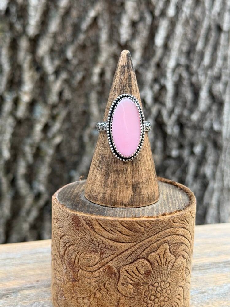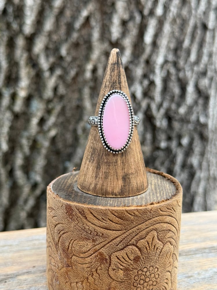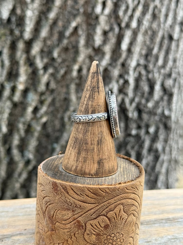 This one-of-a-kind statement ring features a hand-cut sterling silver bear, grounded in strength and shaped by the wild. Above it sits a trio of stones—two Kingman turquoise cabochons paired with a glowing moonstone—bringing together earth and sky in a way that feels both powerful and deeply rooted.