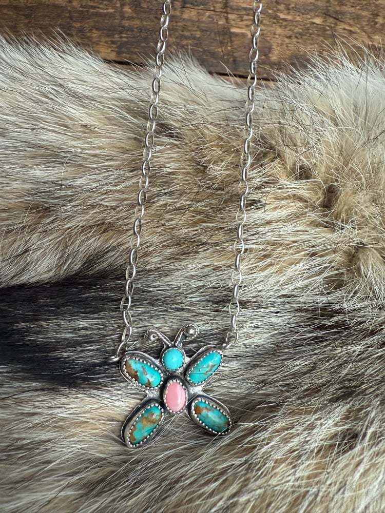 A soft blend of western charm and feminine detail. Features a handcrafted butterfly pendant set with glowing Royston turquoise and a delicate touch of pink conch shell at its center. Each wing is framed with fine silver beading, symbolizing transformation, freedom, and the beauty of the open prairie skies.