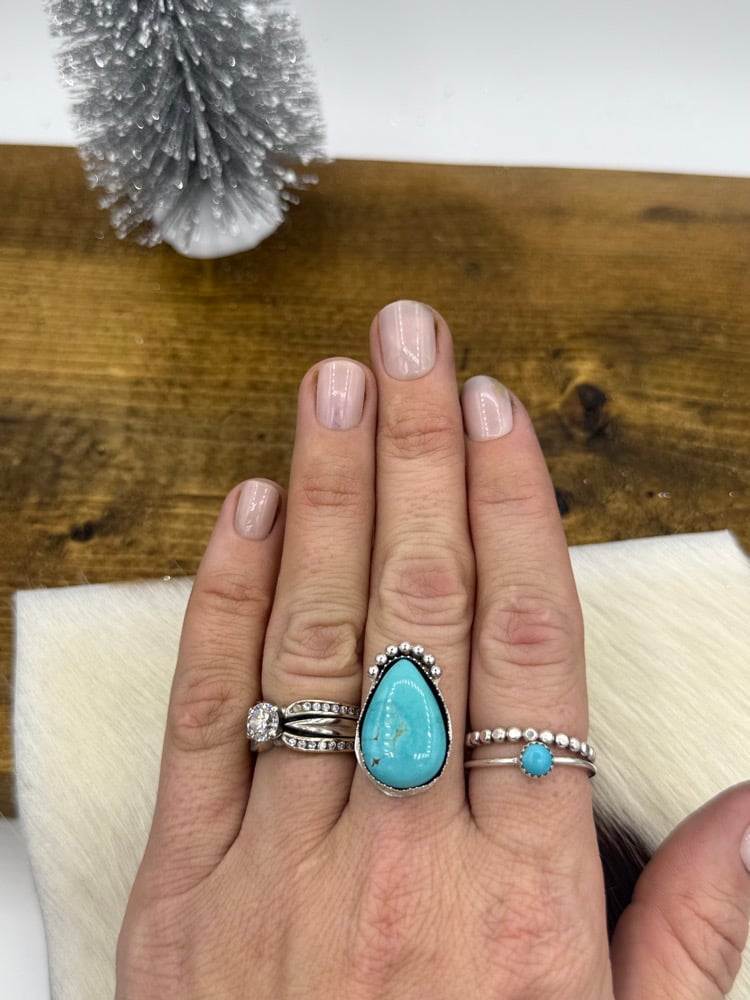 This stunning teardrop Chilean turquoise ring is a true standout — vibrant blue tones, natural matrixing, and that classic Western charm. The stone is framed with a bold beaded top detail, adding dimension and a touch of handcrafted character.