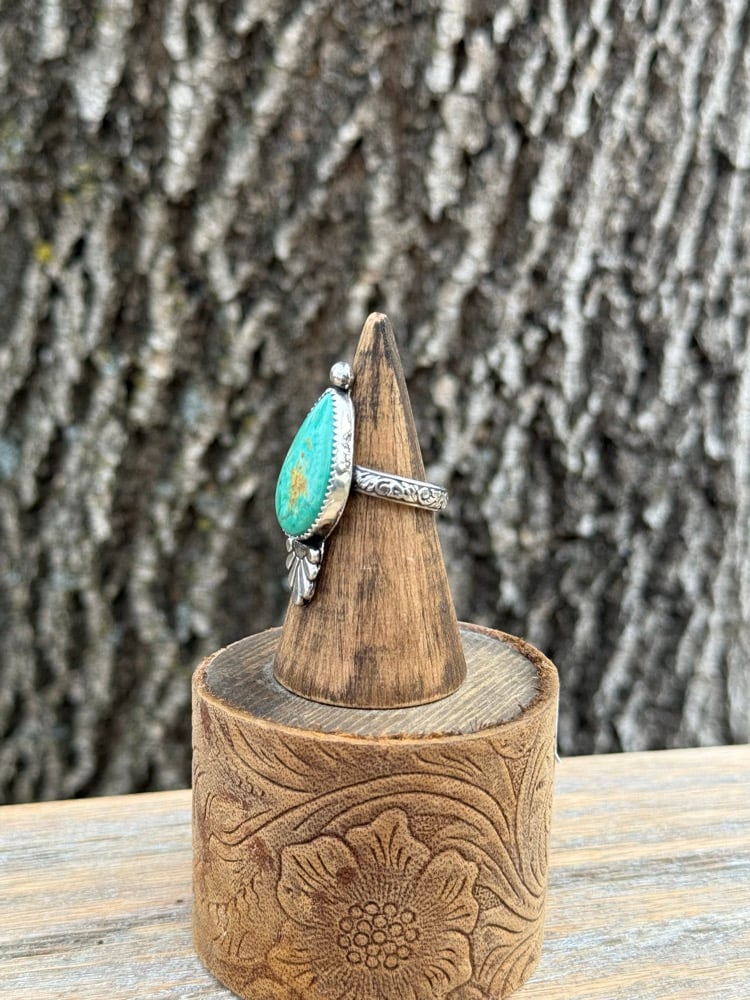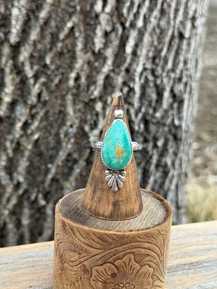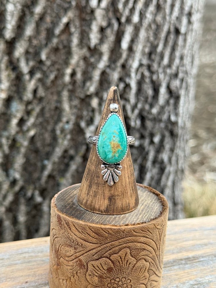 This one-of-a-kind ring features a stunning Tyrone turquoise stone, known for its rich green-blue tones and natural earthy matrix. The teardrop cut gives it that classic, feminine shape while still holding a bold presence on the hand.