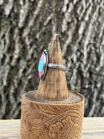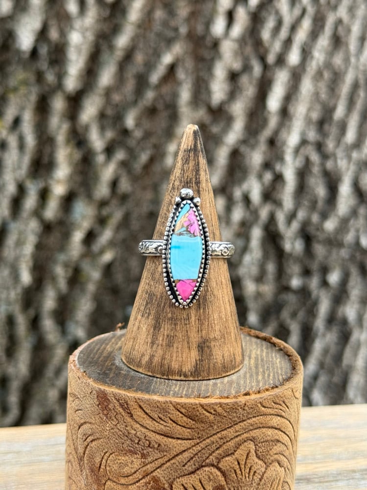 Set in sterling silver with a detailed bead border and finished on a floral-stamped band, this piece blends feminine color with classic western craftsmanship. The long, vertical shape makes it a standout on the hand while still feeling balanced and wearable.