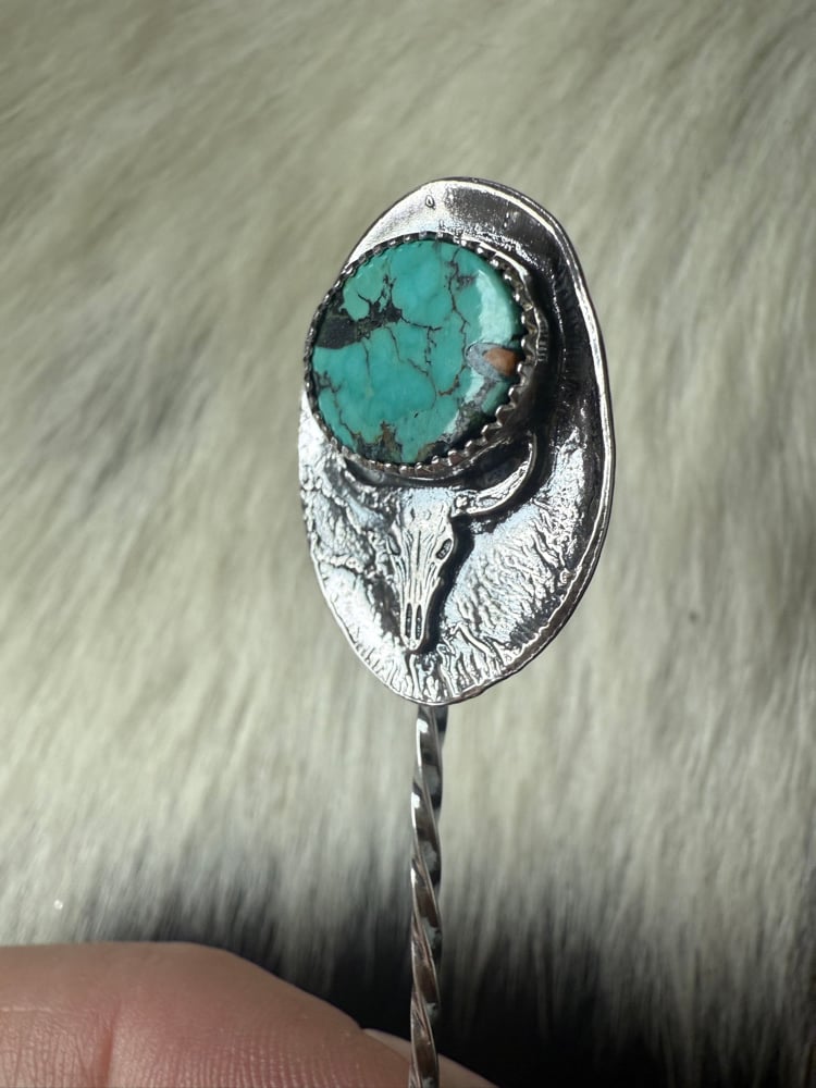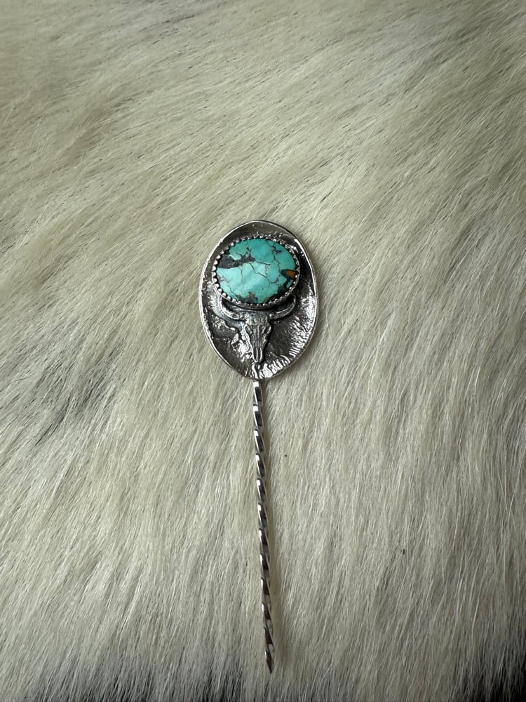 A true Western statement piece — this handcrafted hat pin features a rich turquoise stone set above a detailed longhorn skull, creating the perfect blend of rugged ranch style and classic turquoise beauty. The oval silver backdrop adds depth and texture, while the hat pin design lets you add personality to any felt hat, denim jacket, or bag.