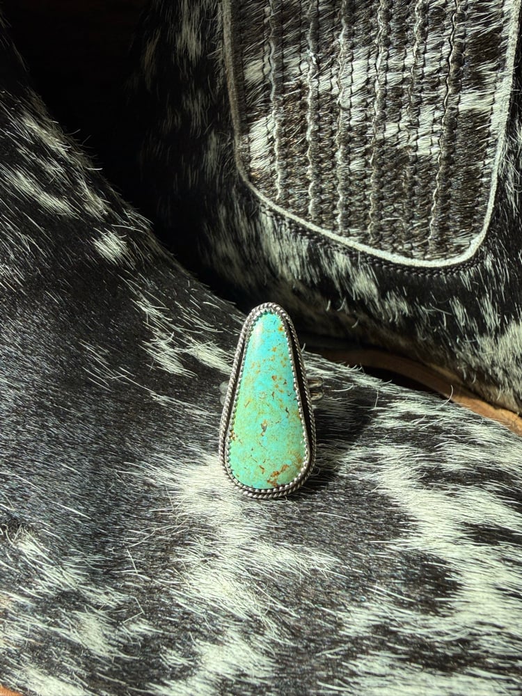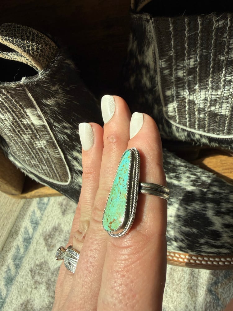 Details: A striking, elongated turquoise set in a classic rope border that highlights the natural color and subtle matrix of the stone. The long silhouette gives this piece a bold, modern western feel—made to stand out on its own or stack alongside your favorites.