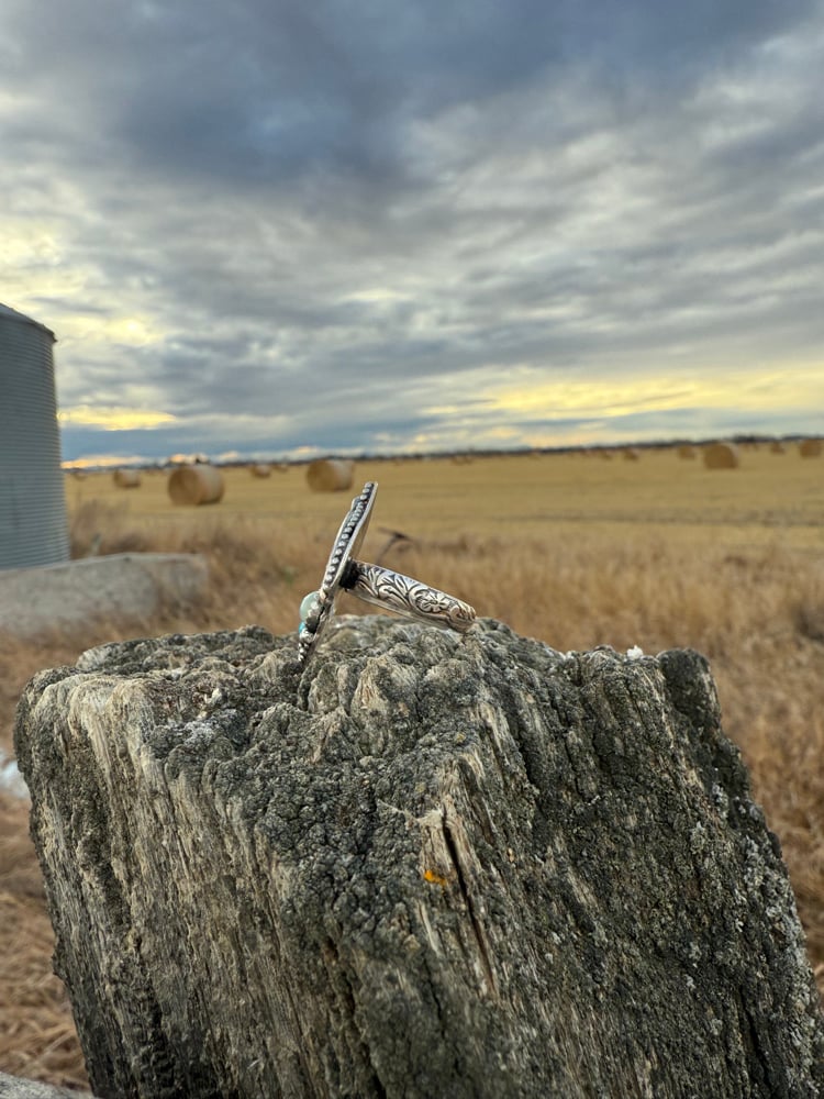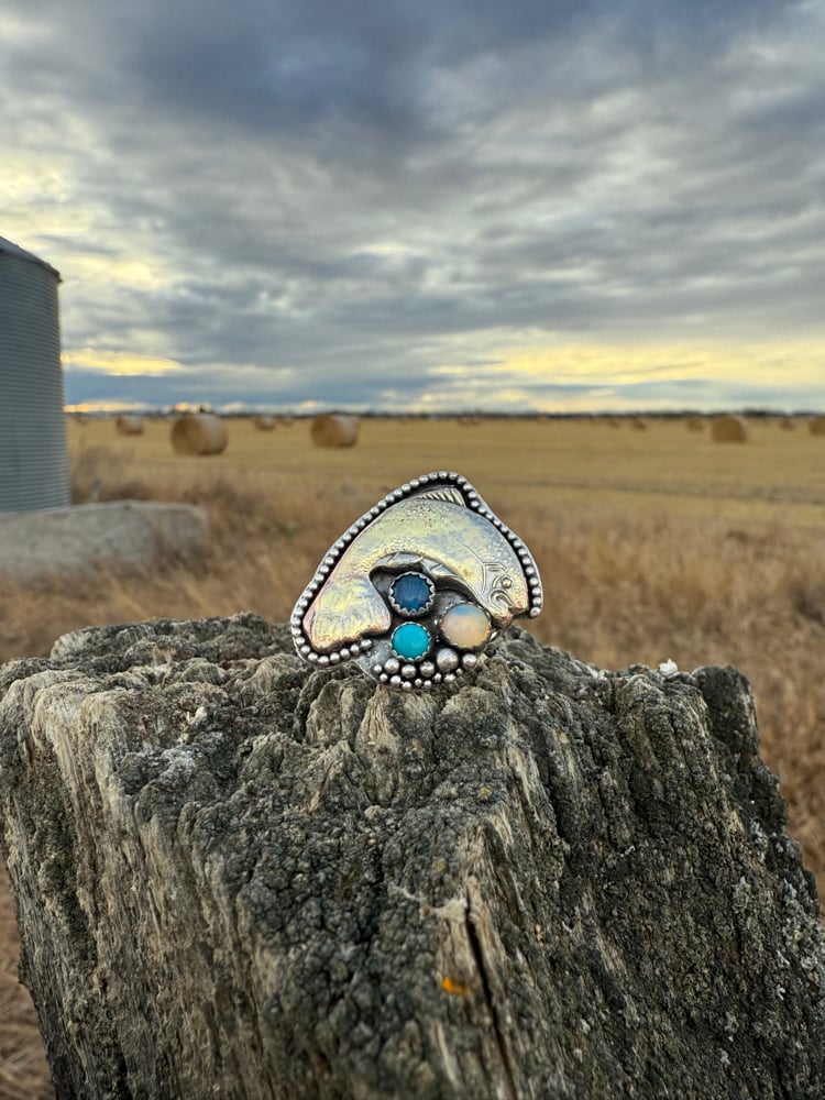 Finished with a comfortable sterling silver floral band, the Golden Trout Ring blends nostalgia, craftsmanship, and prairie-inspired beauty in a way that feels both bold and meaningful.