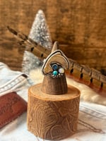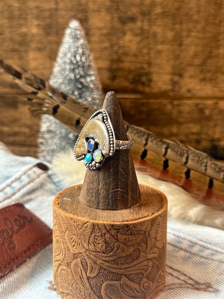 This one-of-a-kind piece features a trio of vibrant stones — turquoise, Australian opal, and white opal — set beneath the trout and accented with handcrafted silver beads. Silver beaded edging adds beautiful texture and depth, making this ring a true statement of Western artistry.