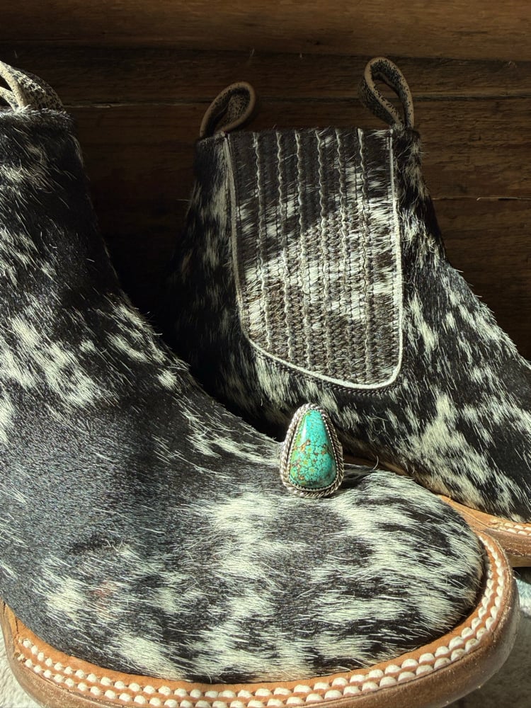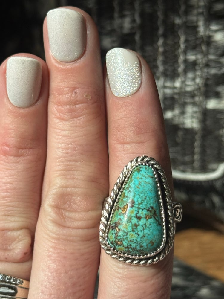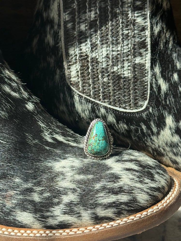Details: A bold, one-of-a-kind turquoise set in a hand-finished rope border, bringing out the raw character and matrix of the stone. Framed in sterling silver with subtle western detailing.