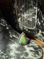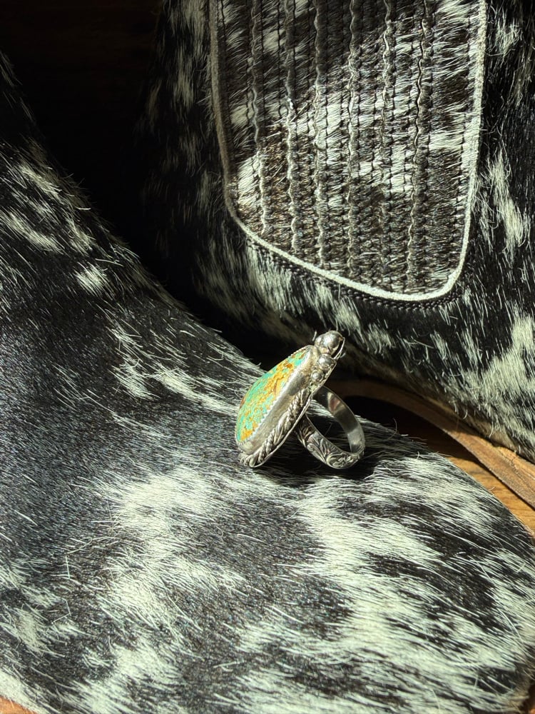 Details: A bold turquoise with rich, earthy matrix, framed in a twisted rope border and finished with hand-applied silver bead accents across the top. The added detail gives this piece a crown-like feel—textured, dimensional, and full of character.