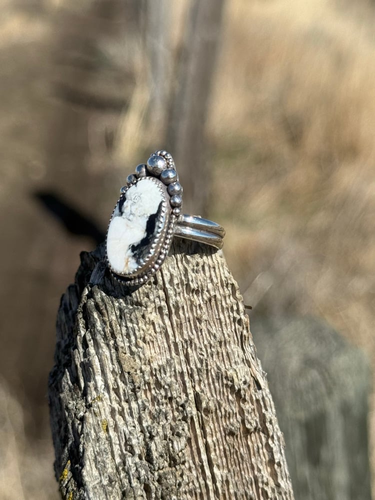 Bold, timeless, and unmistakably Western. The High Plains White Buffalo Ring showcases a striking natural White Buffalo stone, celebrated for its dramatic contrast of creamy white and deep black veining. Set in hand-forged sterling silver, this statement piece is framed with intricate silver beading and finished with a sturdy triple-split band for both comfort and durability.