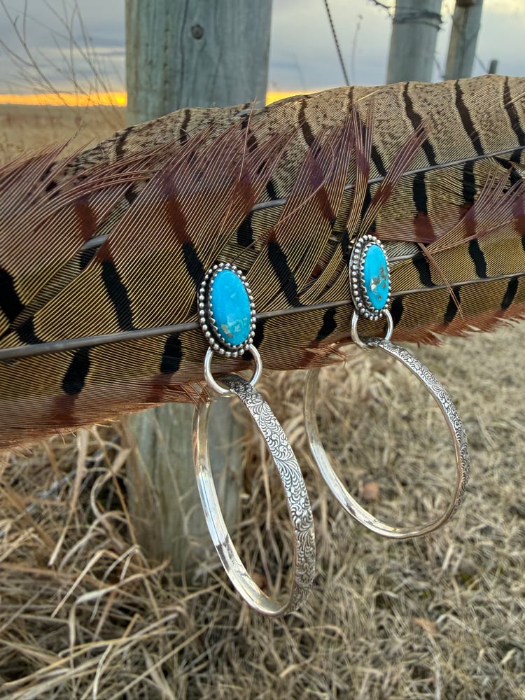 High Prairie Hoops are a brand new design I’m so excited to finally share. Each pair features vibrant Blue Ridge turquoise set in sterling silver with a hand-beaded bezel, finished as a stud for a comfortable, secure fit. A floral-stamped sterling silver hoop drops below, adding movement and that classic open-range feel.