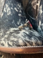 Framed with a classic rope border and finished with subtle silver ball accents, this piece carries that signature handcrafted feel with a modern cowgirl twist. The unique steer-head inspired shape gives it that unmistakable western edge, while the floral band adds a touch of timeless detail and femininity.