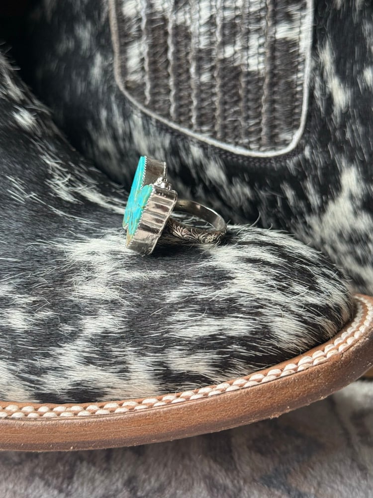 Details: A vibrant Kingman turquoise hand-cut into a butterfly silhouette, showcasing natural matrix and rich blue tones. Set in sterling silver with subtle bead accents, this piece brings a playful yet grounded western feel.