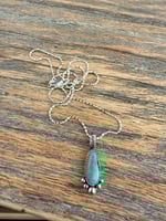 The elongated turquoise stone features soft natural tones and is set in a serrated bezel, finished with a small cluster of silver beads at the base for added texture and movement. The stamped floral bail ties it all together with a subtle, vintage-inspired detail.