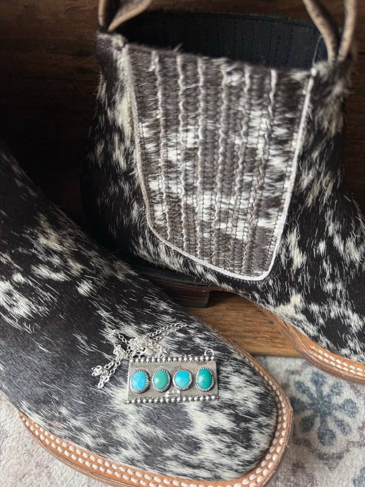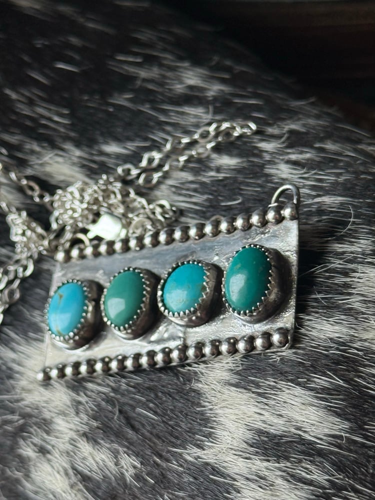 Details: A handcrafted bar necklace featuring four Royston turquoise stones, each with its own unique color and natural matrix. Set in sterling silver and framed with subtle bead detailing, this piece blends a clean, modern shape with classic western texture.