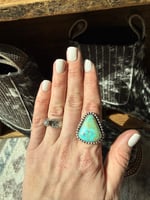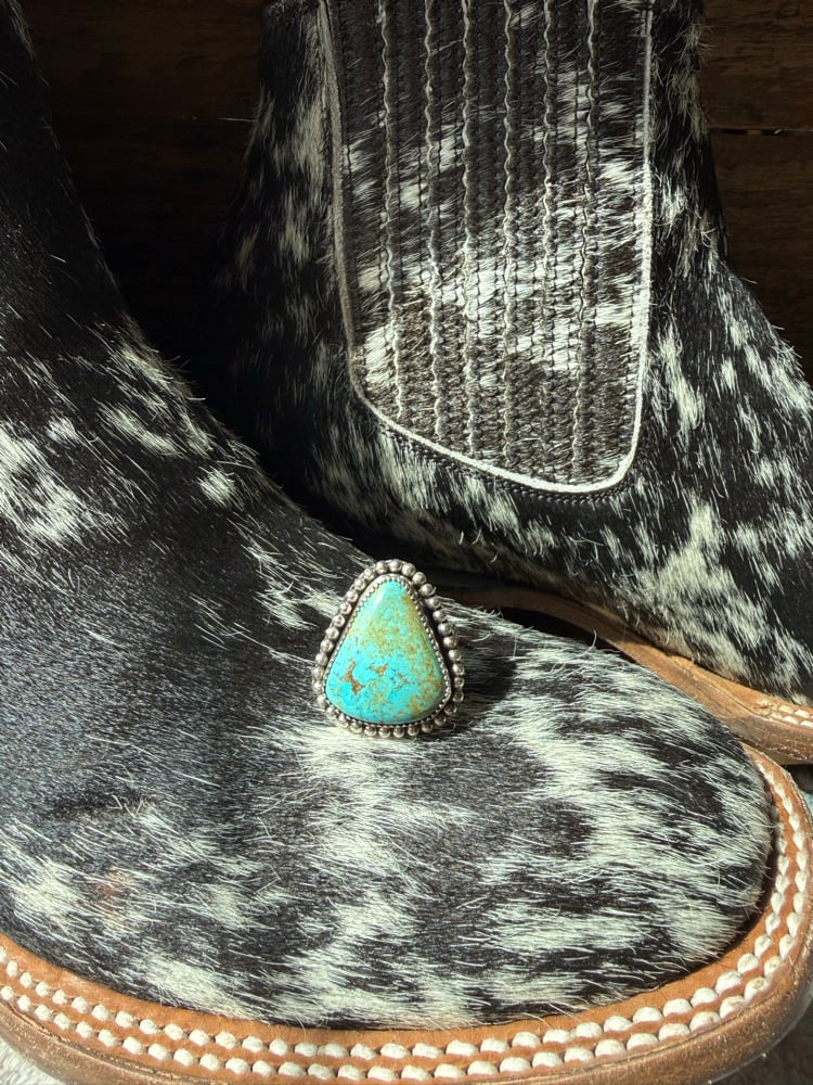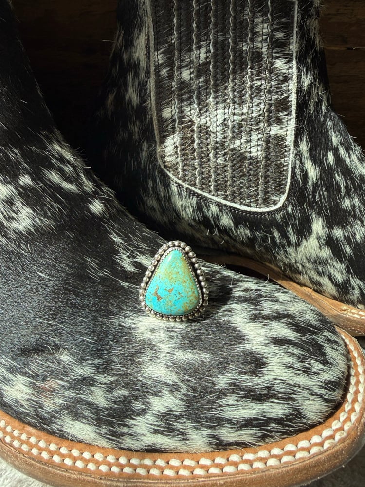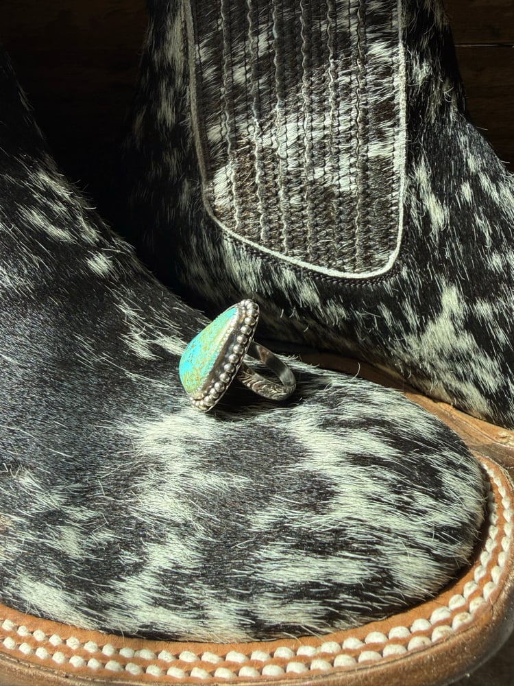 Details: A vibrant turquoise with soft, earthy matrix, framed in a hand-finished beaded border for a classic western feel. This piece has a bold presence while still being easy to wear day to day—one of those rings you’ll keep reaching for.