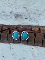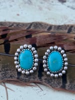 A bold pair of turquoise studs with classic western character. The Silver Spur Turquoise Studs feature vibrant oval turquoise stones set in sterling silver and framed with a full halo of handcrafted silver beads. The bright blue stones paired with the textured silver give these studs a timeless, rugged prairie feel.