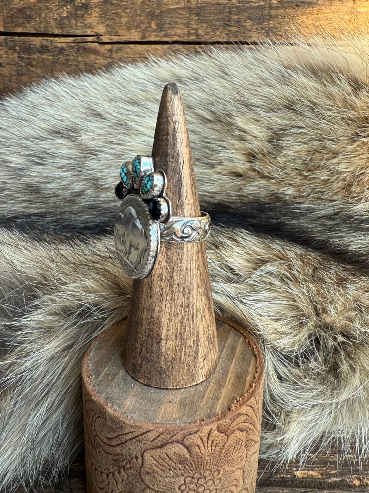 A bold mix of history and western grit. The Highway 52 Ring features a genuine Buffalo Nickel centerpiece framed by Cheyenne turquoise and black onyx stones — a striking contrast that feels both rugged and refined. Set in solid sterling silver with a thick floral band, this piece tells a story of open roads and wild prairies.