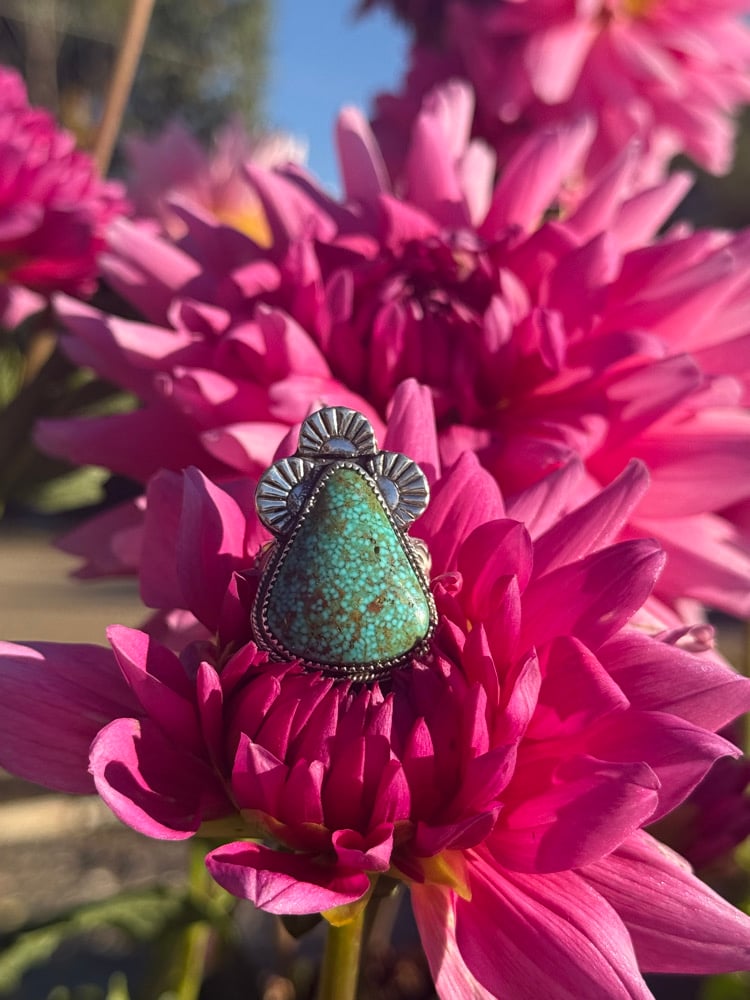 This bold, handcrafted ring showcases a striking Turquoise Mountain stone, known for its vibrant blue tones and unique matrix. Sterling silver accents and a rope detail frame the stone, adding texture and depth to the design.