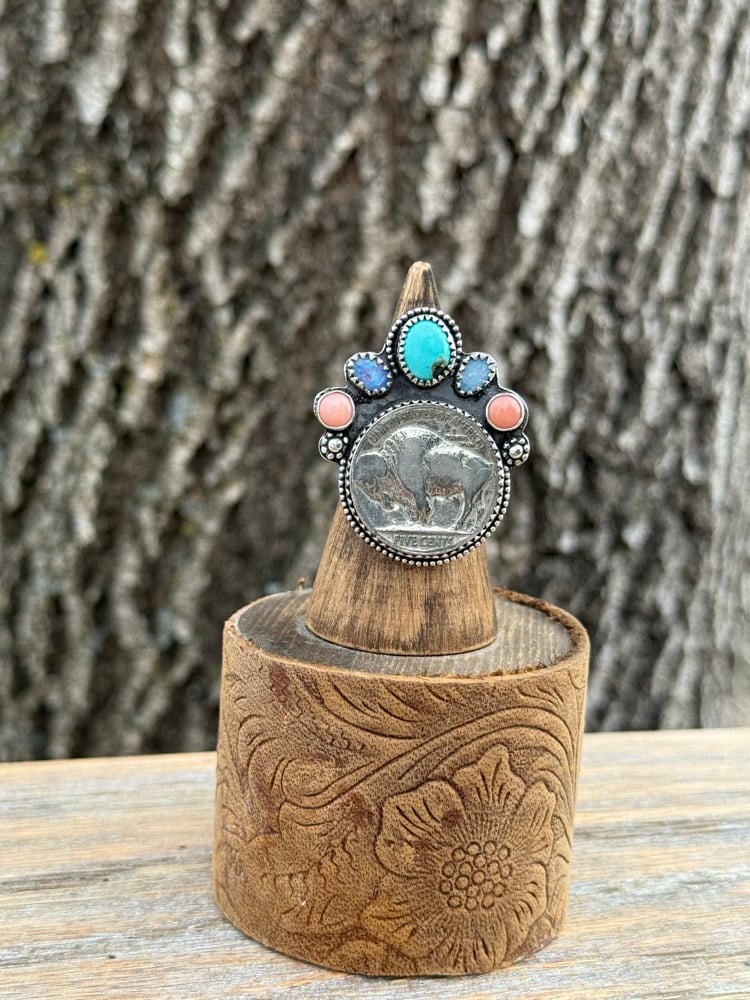 Buffalo Coin Ring with Turquoise, Opal & Pink Conch