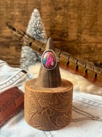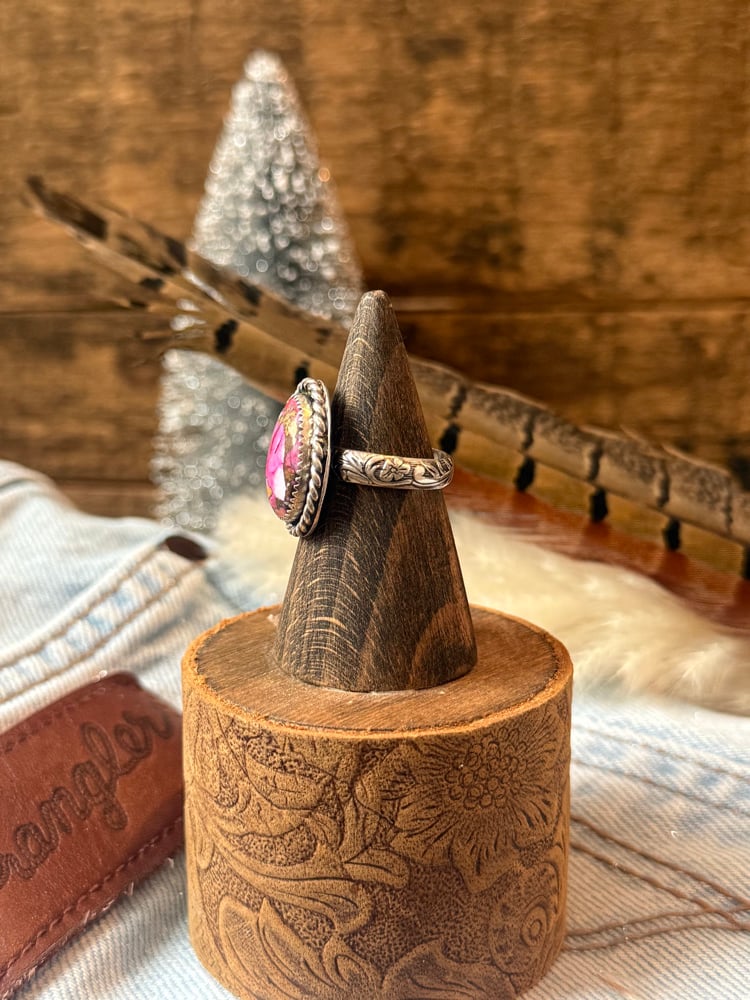 This vibrant, one-of-a-kind ring features a striking spiny oyster stone with bold pink and turquoise hues, framed in a classic rope border for that true Western feel. The floral sterling silver band adds a touch of feminine detail and all-day comfort, creating a perfect blend of statement and rugged prairie charm.