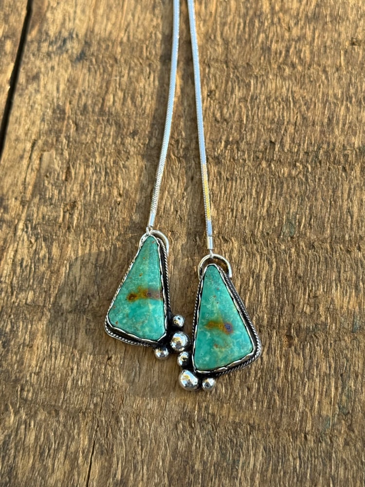 The Desert Bloom Lariat is a modern take on a western classic. Featuring two natural Kingman turquoise stones set in sterling silver with silver accent balls, this necklace brings together bold design and timeless materials. The sleek 24-inch snake chain is finished with a 9mm adjustable slider bead, allowing you to wear it high or low to suit your style. Effortless, versatile, and one-of-a-kind.