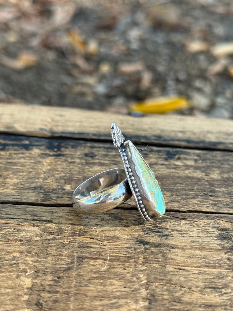 This striking teardrop-shaped ring features natural Sleeping Beauty Turquoise, known for its bright, robin’s-egg blue and soft matrix patterns. The stone is set in a plain sterling silver bezel with a stamped accent at the top, highlighting its clean and classic design.