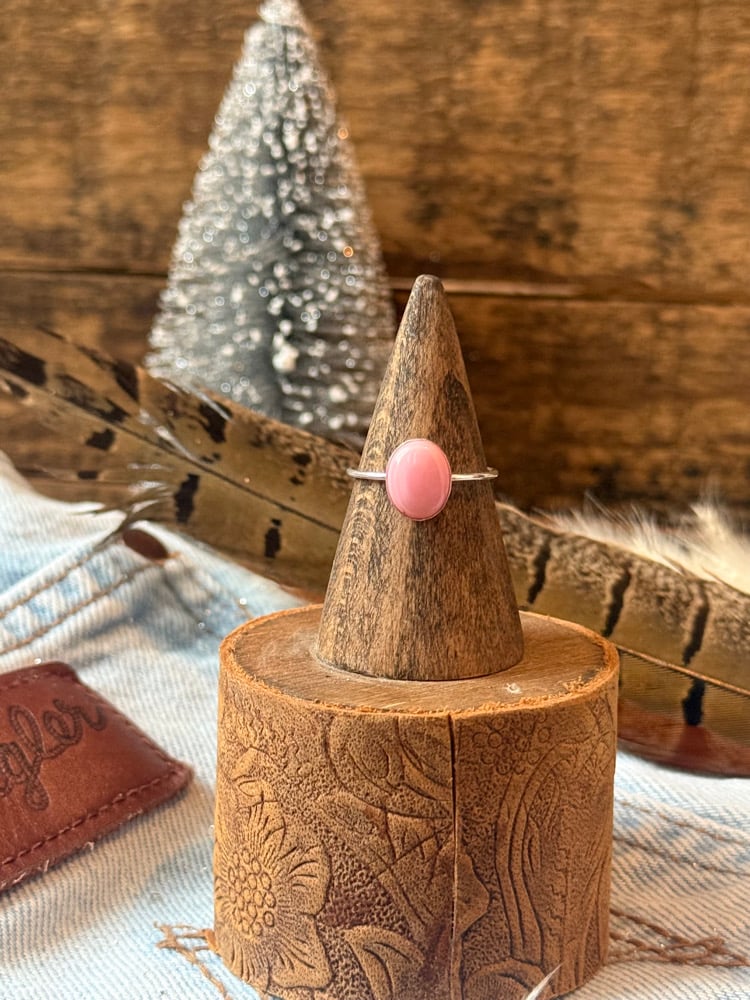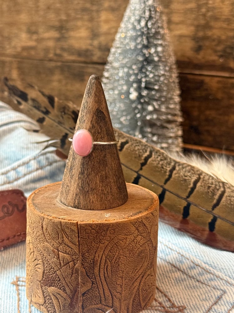 Sweet, simple, and effortlessly feminine — this ring features an 8x10 pink conch stone with a glossy, pastel glow that catches the light beautifully. Set on a plain sterling silver band, it has that perfectly dainty look that makes it ideal for stacking or wearing solo for a soft, minimal moment.