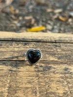 This bold yet romantic ring features a polished black onyx stone cut into a heart shape, symbolizing both strength and love. The stone is framed with a sterling silver beaded border for depth and texture, while the sterling silver floral band adds timeless Western detail.