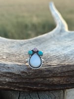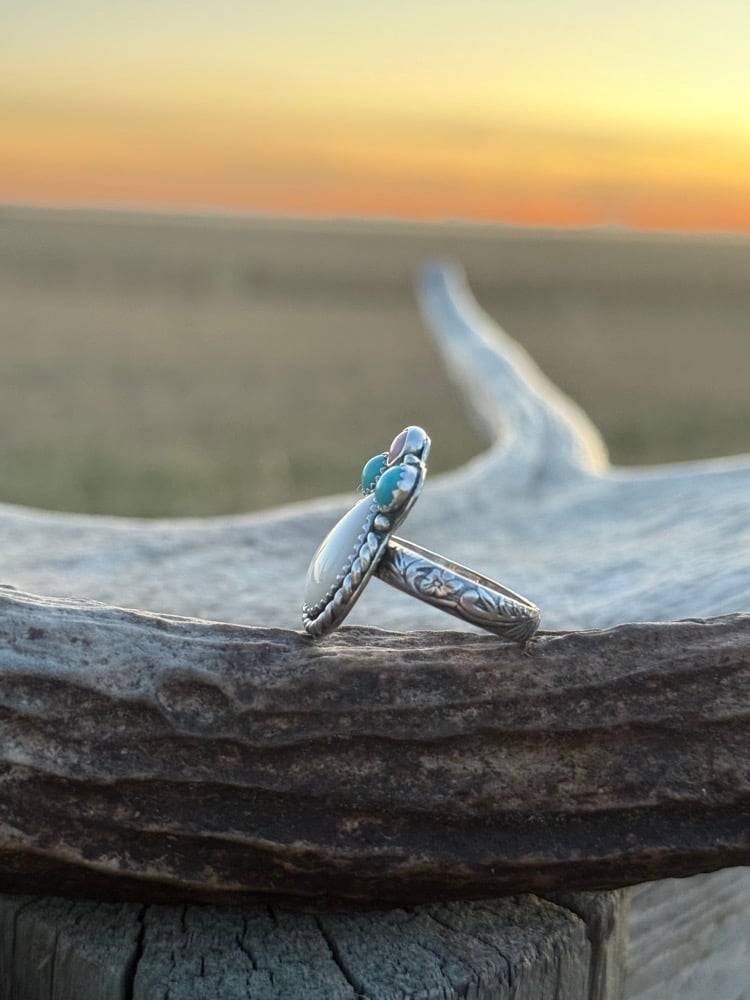 The Painted Prairie Ring was inspired by soft dawn light stretching across open skies. Centered with a teardrop freshwater pearl and framed by Kingman turquoise and pink conch, this trio of stones mirrors the colors of early morning on the range — quiet blues, gentle pinks, and the soft glow of a new day.