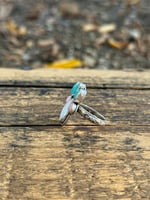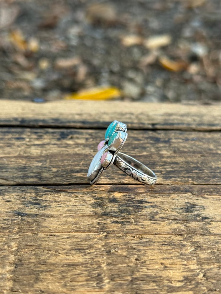 A one-of-a-kind statement ring featuring the soft shimmer of Freshwater Pearl, the delicate blush of Pink Conch, and the vibrant blue-green of Royston Turquoise. Set in solid sterling silver on a detailed floral band, this piece blends prairie romance with timeless Western charm.
