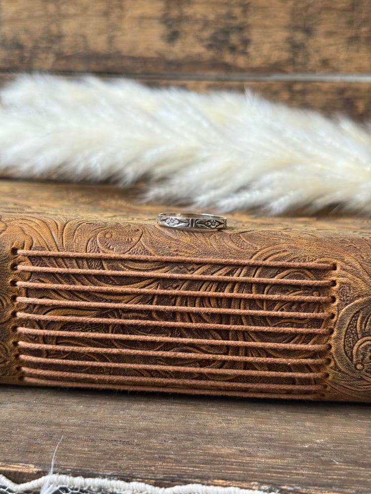A subtle nod to wild prairie blooms, the Poppy Stacker features a delicate floral pattern etched in solid sterling silver. Its fine details and timeless design make it the perfect piece to wear alone for an understated touch or layered with other stackers for a bolder look.