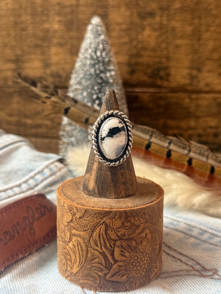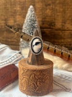Soft, elegant, and effortlessly eye-catching — the Ranchhand Ridge showcases a striking White Buffalo oval stone with its natural marbled patterns and bold contrast. The stone is framed in a classic rope border, adding depth and dimension while keeping the focus on that stunning black-and-white landscape within the stone.