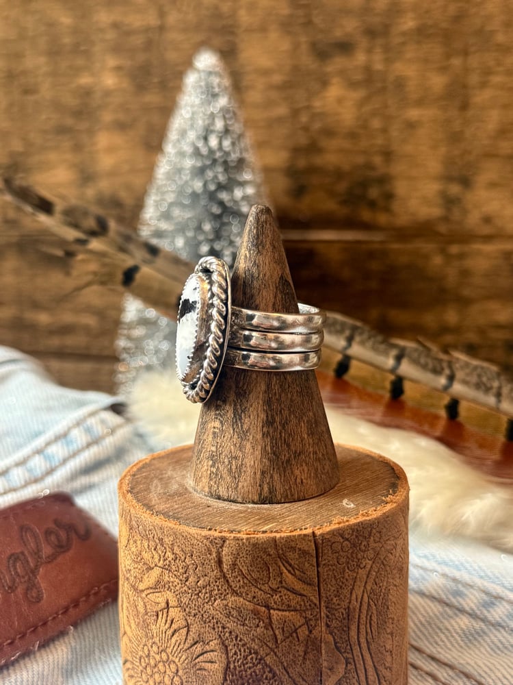 Set on a sturdy sterling silver triple band, this ring blends timeless Western character with clean, refined craftsmanship. A standout everyday piece that feels both grounded and elevated.