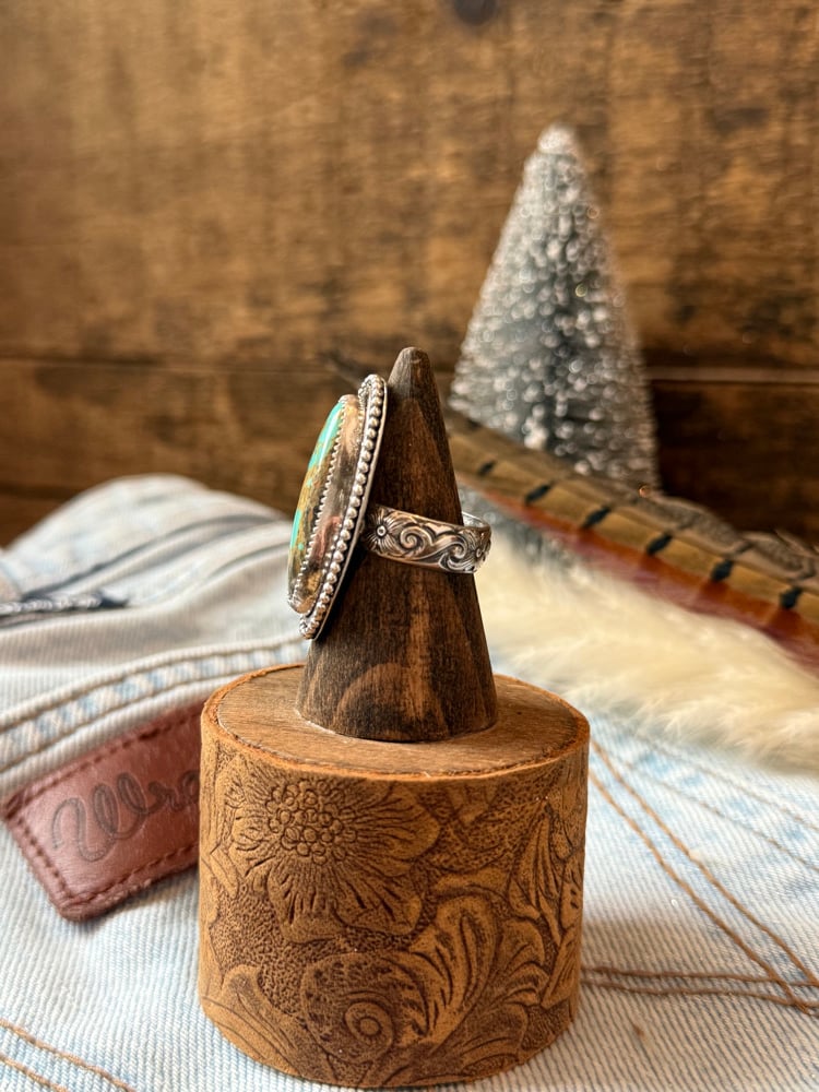 Set on a thick sterling silver floral band, this piece has both presence and balance — a true statement ring that still feels wearable every day. Its elongated silhouette draws the eye instantly, making it a one-of-a-kind treasure for any turquoise lover.