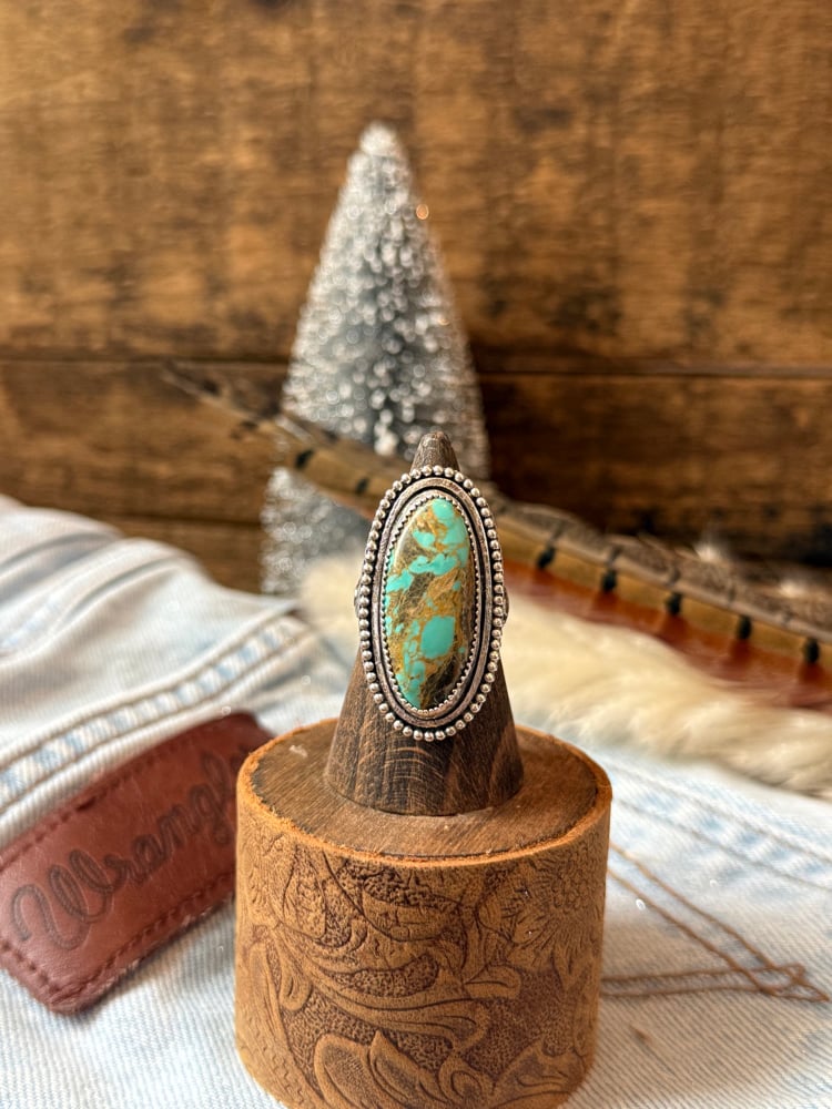 Bold, earthy, and undeniably eye-catching — this stunning ring features a long Tyrone Turquoise stone with rich brown matrix lines and pools of vibrant blue-green running through it. The stone is framed with a clean plain bezel and finished with a detailed beaded edging, giving it that perfect mix of refined and rugged Western charm.