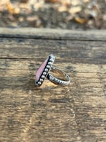 This elegant statement ring features a soft pink conch shell cut in a bold triangular shape. The stone is framed by a sterling silver beaded border that adds depth and texture, while the hand-crafted floral band brings a touch of timeless Western charm.