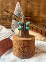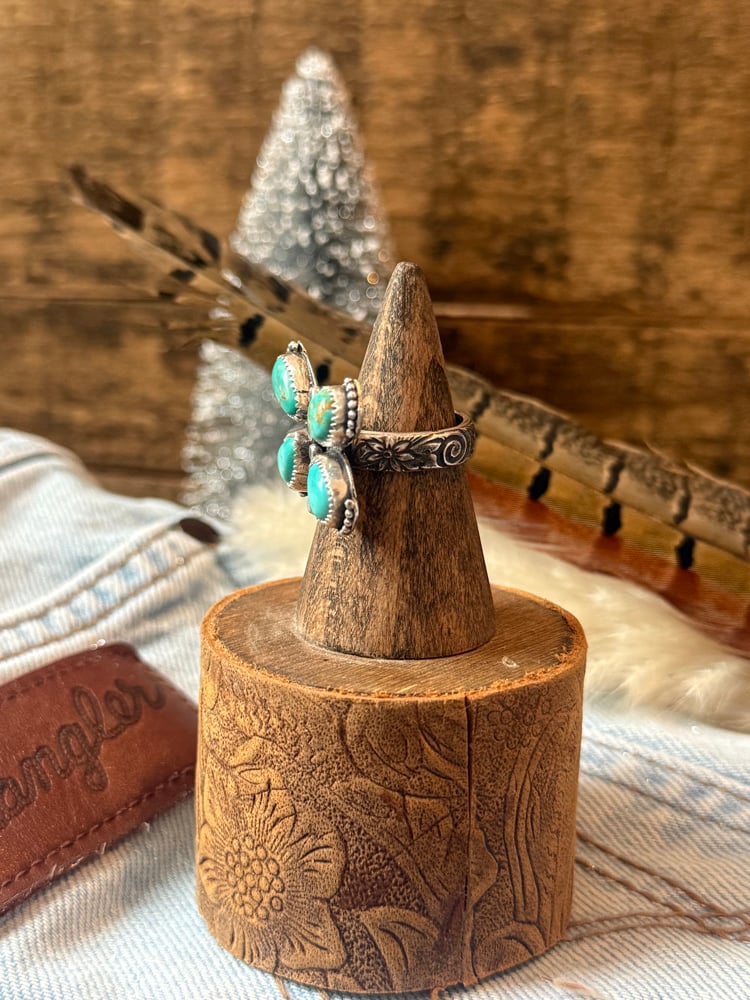 This one-of-a-kind ring features a handcrafted butterfly design made with four gorgeous Royston turquoise stones. The rich green-blue hues and natural matrixing give this piece a striking Western feel, while the bead accents add depth and dimension. Set on a detailed floral sterling silver band, this ring is full of charm, character, and artisan craftsmanship.