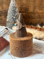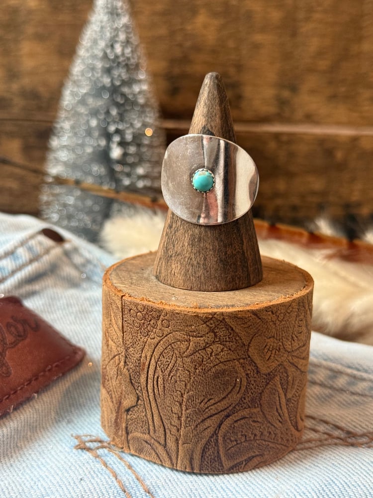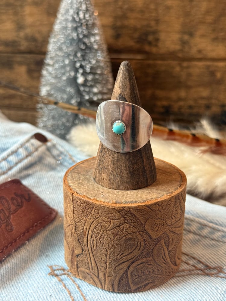 A little Western, a little vintage, and completely one-of-a-kind — this saddle-style ring is handcrafted from a repurposed sterling silver spoon, giving it that perfectly worn-in shine and character. A 5mm Kingman turquoise stone sits centered on the curved face, adding a bright pop of blue that feels classic and timeless.