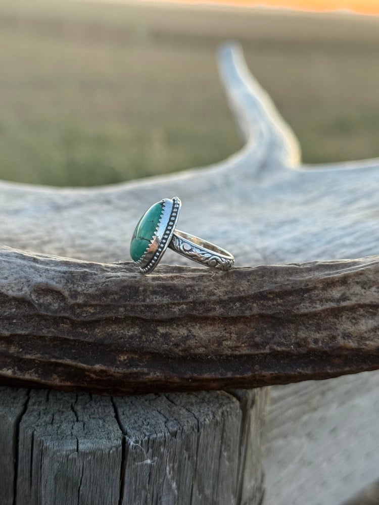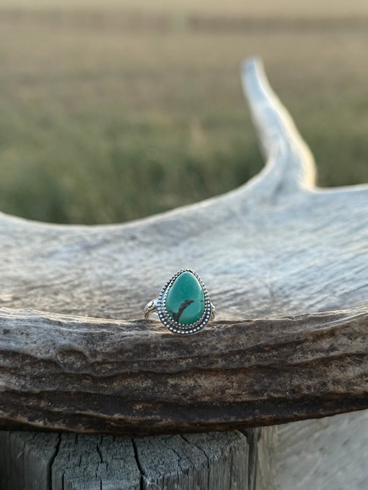 The Saddle Ridge Ring embodies the spirit of the open range ā where turquoise skies meet weathered trails. This teardrop-shaped Royston turquoise stone glows with natural warmth, framed by a hand-forged sterling silver beaded border and finished with a floral band that adds a soft, timeless touch.