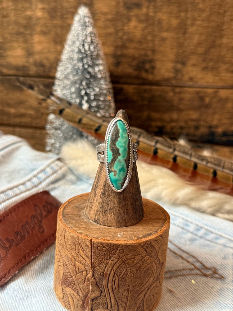 This bold and elegant statement ring features a striking oval Tyrone turquoise stone measuring approximately 13 x 30 mm. Its long silhouette, rich blue-green tones, and natural matrix make it a truly memorable piece. Set in sterling silver with a split-shank floral band, it offers both comfort and intricate Western detail.