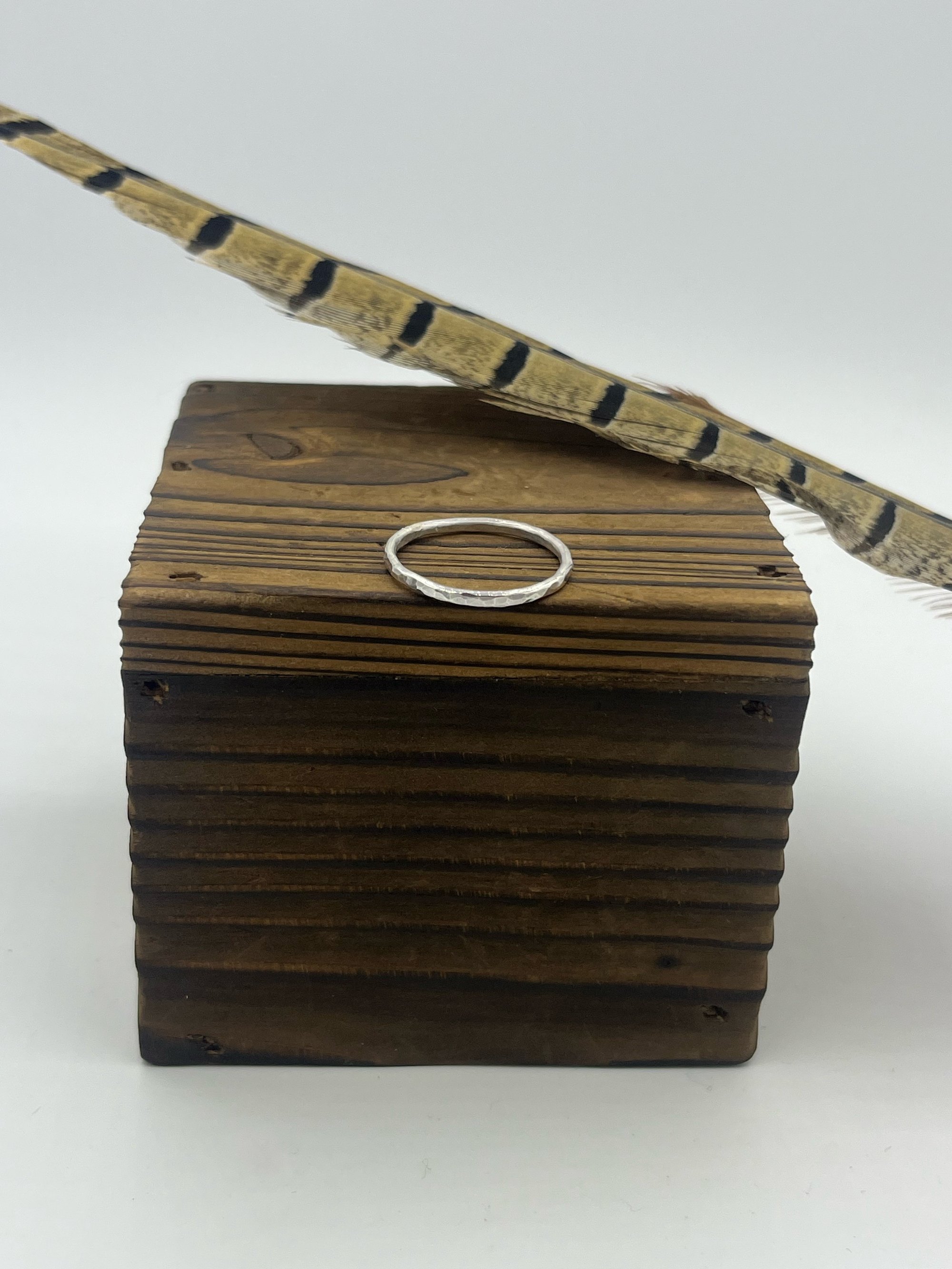 The Simple Silver Stacker is a minimalist classic — hand-forged from 16-gauge sterling silver with a subtle hammered texture that catches the light just right. Its slim, timeless design makes it the perfect everyday piece to wear solo or mix and match in your favorite stack.