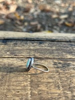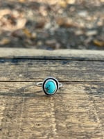 This delicate yet vibrant ring features a natural Kingman Turquoise stone, glowing with rich blue tones and earthy matrix details. The stone is set in sterling silver with a hand-cut bezel and framed by a subtle rope edge, giving it a timeless Western touch. A dainty sterling silver band keeps the design lightweight and perfect for everyday wear.