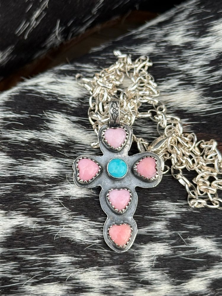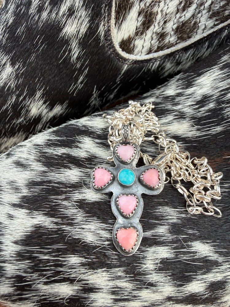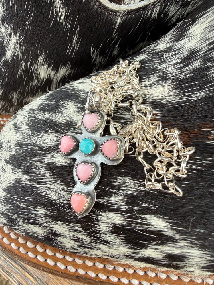 The Wildheart Cross Necklace is a delicate statement piece made for everyday wear. Featuring soft pink conch heart stones paired with a bright kingman turquoise center, this petite cross balances femininity with western soul.