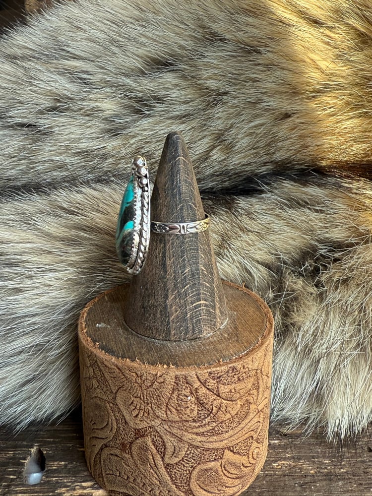 Flowing with natural beauty and prairie spirit, the wildflower skies features a stunning teardrop turquoise stone framed in a rope border with silver ball accents. The rich veins and tones of the stone evoke winding rivers and rugged trails — a perfect symbol of calm strength and western grace. Set on a sterling silver floral band, this piece is both timeless and bold.