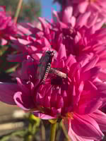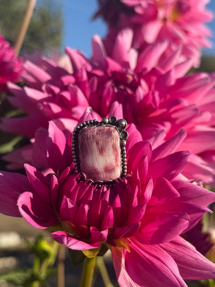 This bold rectangular ring features a natural Spiny Oyster shell with rich striations of deep plum, rose, and ivory tones. The stone is framed with a sterling silver beaded edge and topped with playful silver ball accents, adding texture and balance. A handcrafted sterling silver floral band completes the design, offering both elegance and strength.