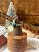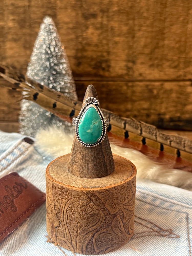 Bright, bold, and full of Western character — this ring features a vivid teardrop-shaped Chilean turquoise stone with striking natural warmth and depth. Set in a beaded border and finished with a silver accent at the top, it has just the right amount of detail to make the stone stand out beautifully.