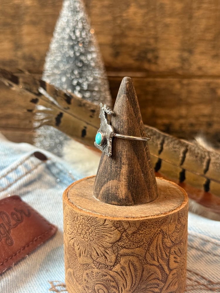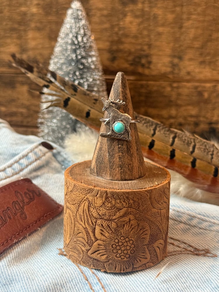 Rustic, charming, and full of story — this ring is handcrafted from a vintage moose souvenir spoon, carefully cut and transformed into a one-of-a-kind piece of wearable art. The sterling silver features a raised moose motif, paired with a vibrant 5mm turquoise stone that adds the perfect pop of color. The design sits on a comfortable sterling silver band, creating a piece that blends nostalgia, craftsmanship, and Western character.