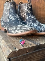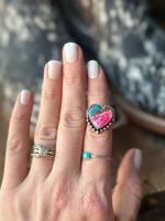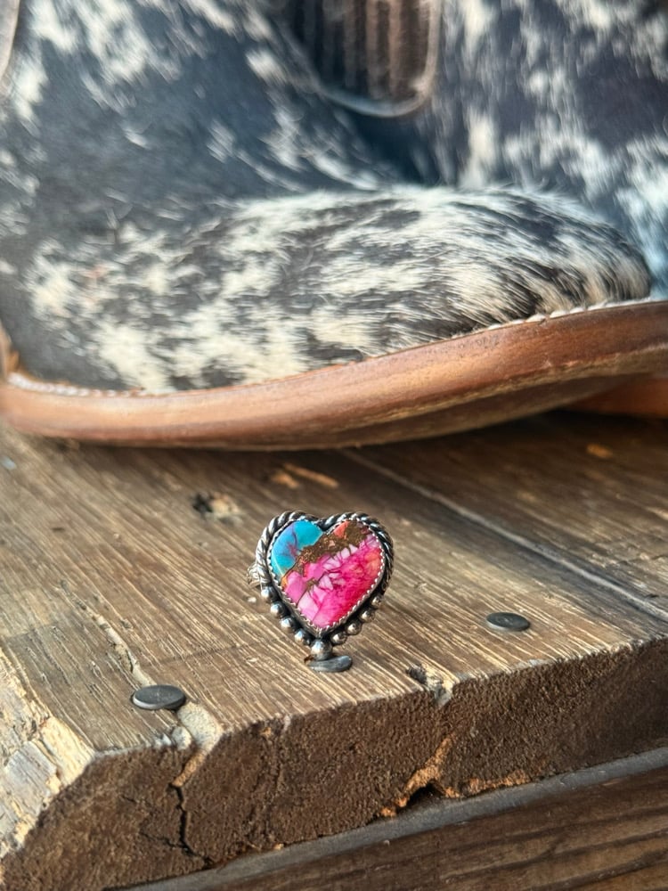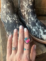 Sweet and striking, this one-of-a-kind ring features a Pink Dahlia Turquoise stone with soft swirls of blush pink, white, and grey matrix. The teardrop-shaped stone is accented with a cluster of sterling silver balls at the top for bold Western charm. A sterling silver floral band completes the design, adding both beauty and durability.
