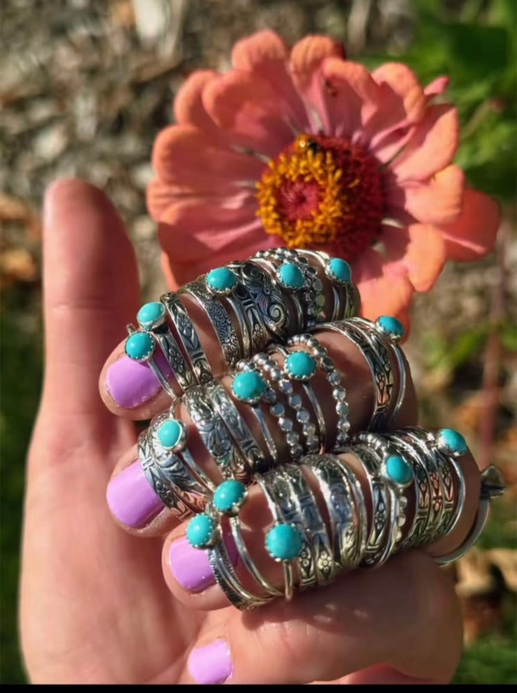 A timeless touch of turquoise. The Turquoise Stacker is crafted from solid sterling silver and set with a 5 mm Kingman turquoise stone — a stone known for its striking sky-blue hue and natural matrix. Dainty, simple, and full of meaning, it’s perfect on its own or paired with your favorite silver bands.