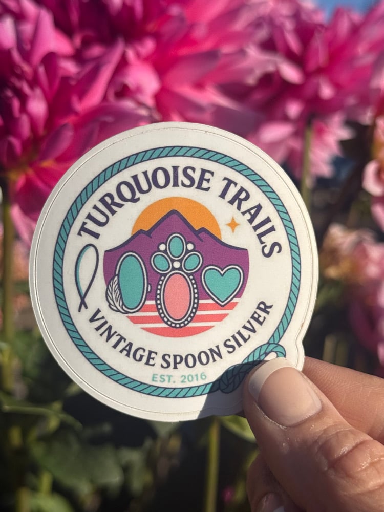 Inspired by the wide-open prairies and winding trails that lead to the mountains, this Vintage Spoon Silver original design captures the heart of turquoise jewelry and western adventure. With bold, colorful rings set against a desert sunset and framed by a rope border, itβs a perfect way to carry the spirit of the West wherever you go.
